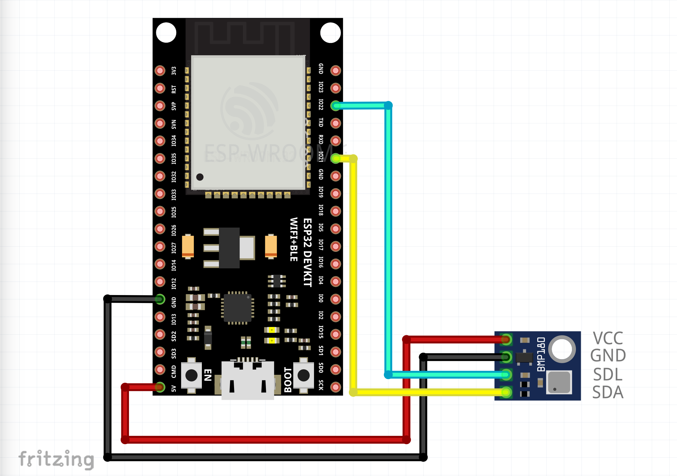 To use a BMP180 sensor with Tasmota, you'll need to connect it to the ESP32. Follow the wiring diagram provided with the BMP180 to connect the sensor to the ESP32 using the GND, VCC, SDA, and SCL pins. Please make sure the ESP is not powered, before you start wiring anything. Typically SDA and SCL connect to pin 21 and 22 respectively.