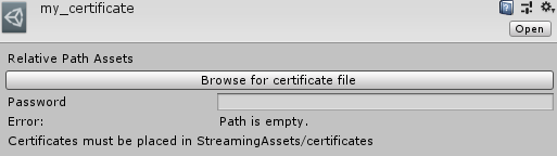 The certificate is not shown, because it can't be decoded without a password. As soon as you enter the correct password, it should show the certificate as seen above. Unless already done, copy the certificate file to StreamingAssets by clicking the button.
