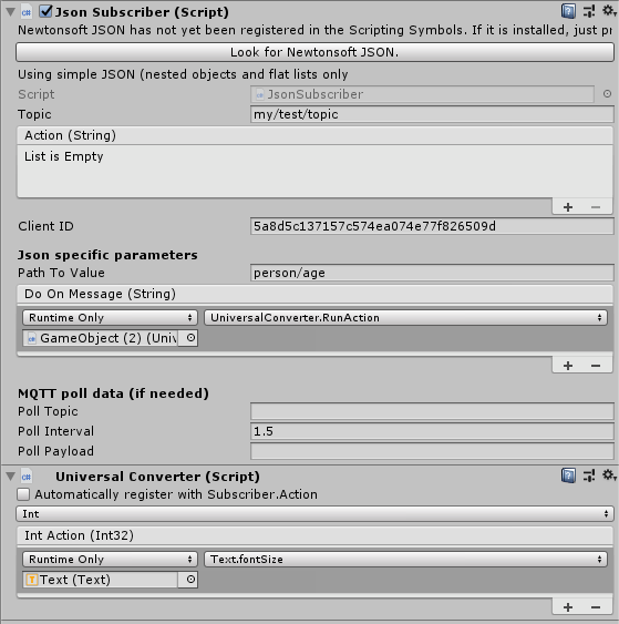 When working with lists, the complexity is limited to a single list index in the path. Complex nesting is not supported right away, because the interpretation works on regular expressions, to avoid third party dependencies. If you decide to install NewtonSoft Json, though, you can click the "Look for NewtonSoft Json" button in the inspector after installation. After a few moments it should detect the package and support more complex JSON payloads.