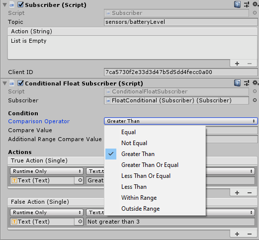 This component compares a given string with incoming MQTT messages and Invokes all the UnityActions in TrueAction if it matches and those in FalseAction if it doesn't.
